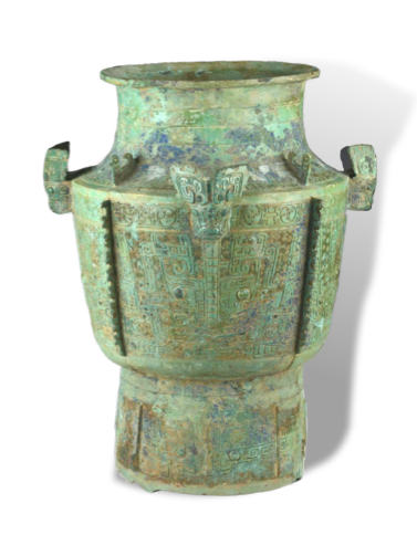 它的肩部分饰四个牺首,牺首之间有四只扁身凤鸟。腹部与圈足上各有四道扉棱。腹部主纹为四个雄伟的兽面,上部为圆涡纹,中间为“米”字纹,下部有三条鱼纹。其上的鱼纹充分体现了洞庭湖青铜文化的湖湘特色。