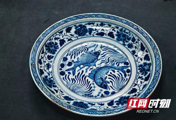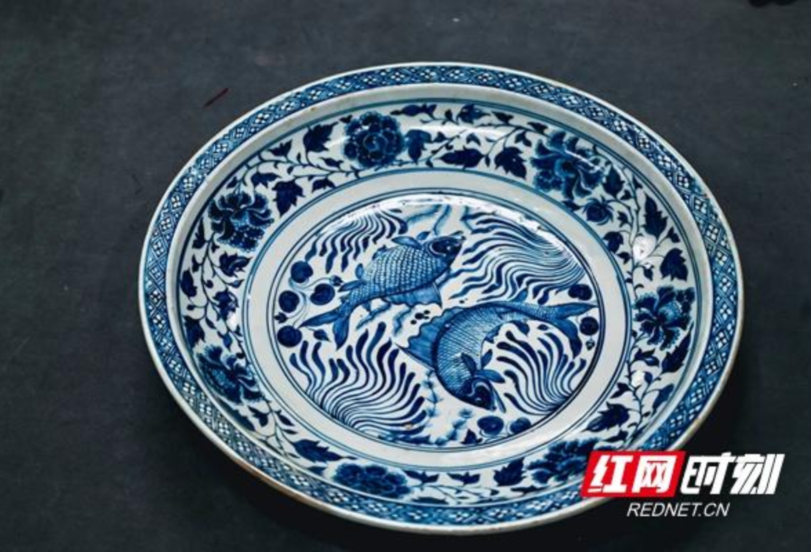 文物出差啦①丨元青花牡丹水藻双鱼纹折沿盘来岳阳了!这波颜值拉满